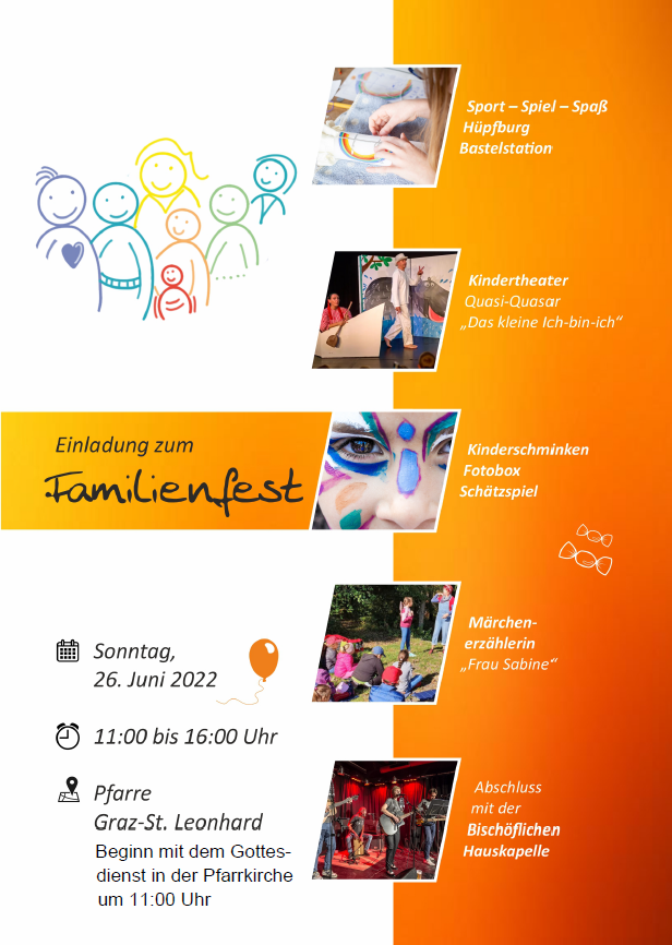 Wir beginnen mit einem gemeinsamen Gottesdienst um 11:00 Uhr in der Pfarrkirche Graz-St. Leonhard. Danach gibt's Sport, Spiel und Spaß, angefangen von der Hupfburg Kirche über Sportgeräte, Kinderschminken, Märchenerzählerin bis zu "Das kleine Ich bin ich" vom Quasi-Quasar-Mitmachtheater, Fotobox und Schätzspiel! Für Essen und Trinken ist gesorgt.