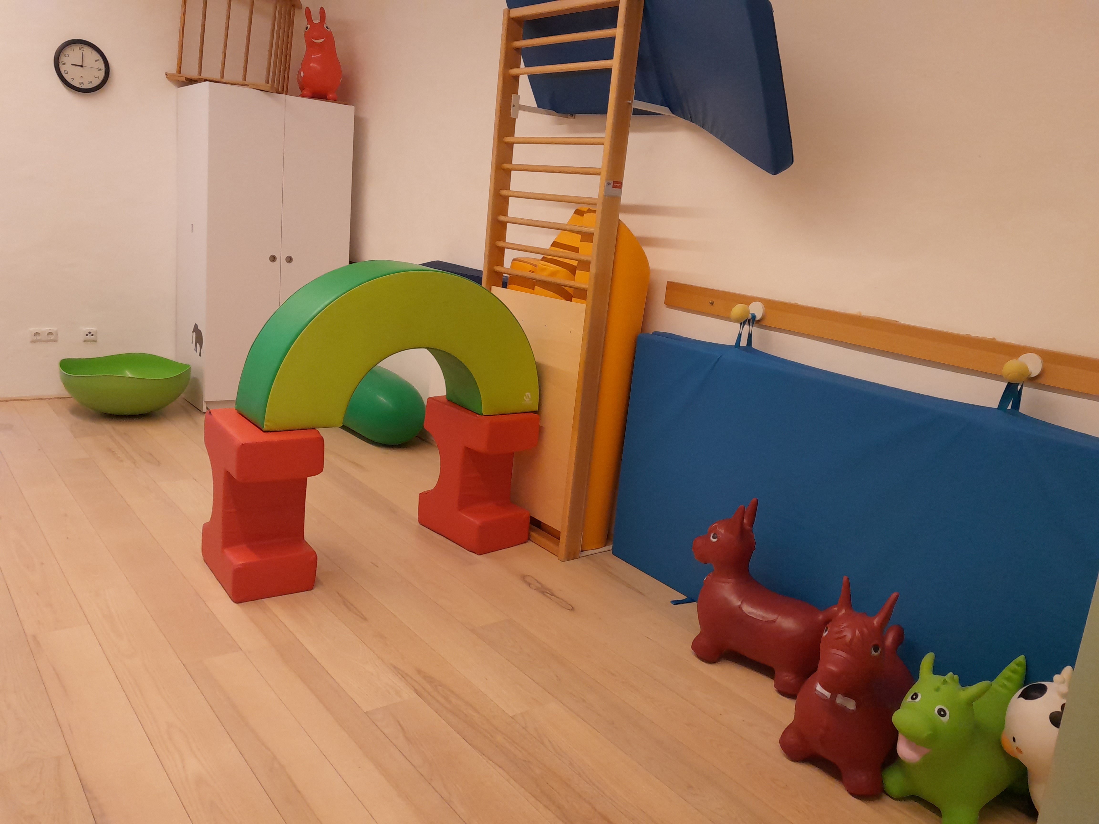 Um ihrem Bewegungsdrang nachzukommen, steht den Kindern zu dieser Zeit der Bewegungsraum zur Verfügung, ebenso können die Kinder am Gang mit den Rutschautos fahren oder mit dem Puppenwagen spazieren gehen.