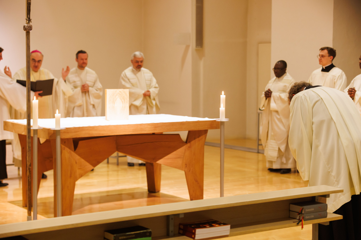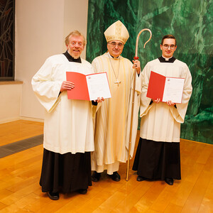 Auf dem Weg der Nachfolge lässt man sich aber immer mehr und mehr in das Lebensgeheimnis Jesu ein. Es sei nicht nur ein Nachahmen, sondern „ein sich selbst in die Fußstapfen Jesu begeben, in dem Seine Lebensart immer mehr zu der eigenen wird.“ Der Bischof wies darauf hin, dass der Maßstab sei, ganz für die Menschen, mit denen man unterwegs ist, zu leben. Sein Wunsch: „Wenn du, Thomas, heute zum Dienst als Akolyth beauftragt wirst, dann ist dies nicht bloß der offizielle Auftrag der Kirche, die Kommunion zu spenden oder liturgische Dienste auszuüben. Es geht um den innersten Kern christlicher Berufung, den zu vertiefen Du Dich auf den Weg gemacht hast. Lass möglichst viele daran teilhaben!“