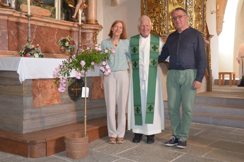 Am Schluss der Heiligen Messe sprach Toni Gschier im Namen des Pfarrgemeinderates seinen Dank an das Ehepaar Maria und Werner Reisner aus. Beide beenden mit Schulschluss ihre Tätigkeit als Religionslehrer und treten in den Ruhestand. Toni Gschier hob das vielfältige und nie nachlassende Engagement von Maria und Werner sowohl in ihren Schulen als auch in der Pfarre hervor; sie haben versucht, das Christsein den Schülern vorzuleben und mit ihnen zu teilen. Ulrike Stampler überreichte als Zeichen des Dankes und der Anerkennung im Namen aller Pfarrgemeinderäte einen blühenden Rosenstrauch, verbunden mit den Segenswünschen für die kommende Zeit.