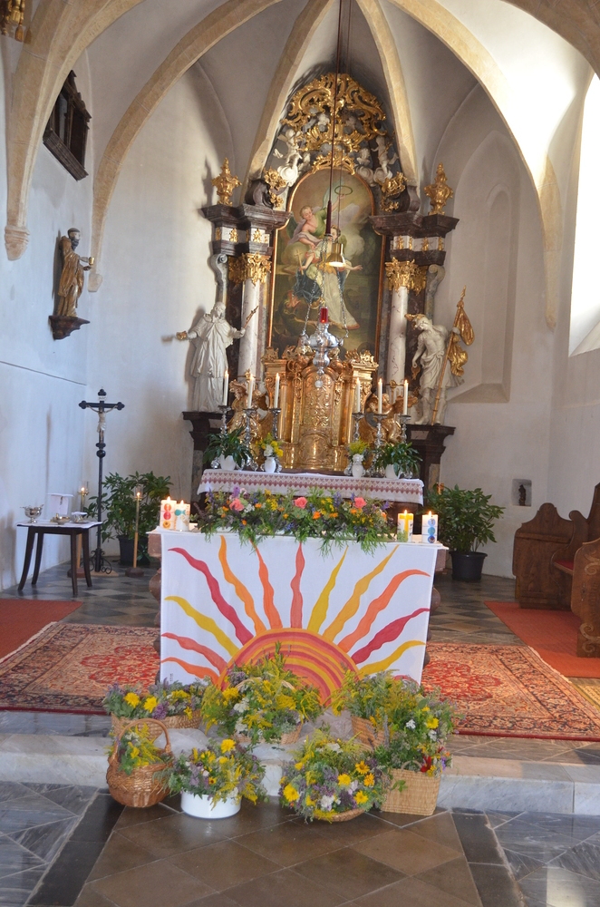 Die bunten Kräuterbüscherln, die den Altarraum prächtig schmückten und allen Mitfeiernden einen guten Duft in die Nase legten, wurden am Vortag in Peggau von fleißigen Händen gebunden. Diese konnten am Ende der Feier, gegen eine freiwillige Spende, mitgenommen werden.