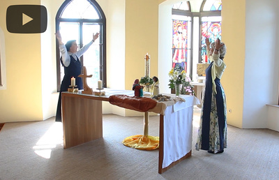 Barbara Koren und Sr. Maria Leopold tanzen zum Lied „Halleluja! Seht, was Gott getan“ in der Schlosskapelle Dobl. In ihrer Mitte befindet sich die Osterkerze, als Symbol der Auferstehung.