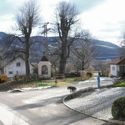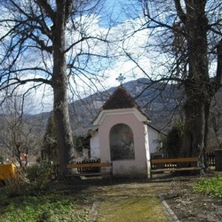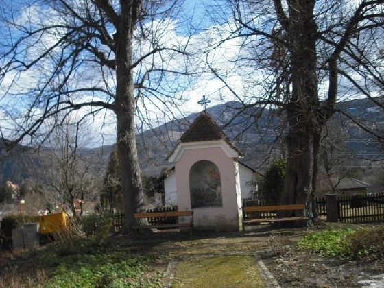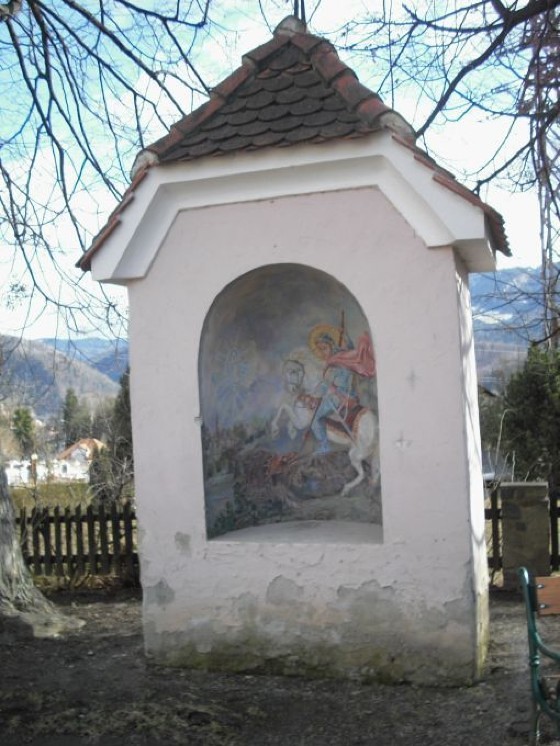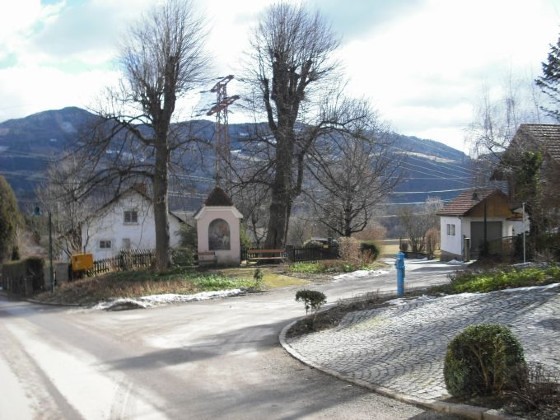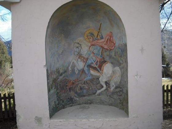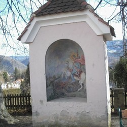 Gegenüber dem Altenheim in Adriach steht am Beginn der Straße der Archäologie zwischen zwei alten Lindenbäumen ein Bildstock mit der Darstellung des heiligen Georg. Wann dieses Zeichen des Glaubens errichtet wurde, ist – genauso wie das Baudatum des Georgi-Hausbildstocks auf dem Anwesen der Familie Fassl vulgo Hacker – leider nicht bekannt. Auf Initiative des Adriacher Kirchenrates wurde der Bildstock vor 18 Jahren renoviert. Lieselotte Reicher Kuhna, die auch die Fastenbilder am Hochaltar in der St. Georgs-Kirche und in der Pfarrkirche restauriert hat, übernahm dabei die Restaurierungsarbeiten an der Malerei, die vom Kunstmaler Alois Riegler stammt. Das Bild zeigt den mit dem Drachen kämpfenden Georg zwischen der Pfarrkirche und der Kirche Adriach. Am Firmament erscheint Maria.
