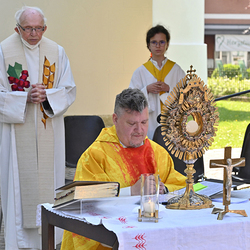 Das „Hochfest des Leibes und Blutes Christi“ feierte die Pfarr­gemeinde Gamlitz auf dem Kirch­platz bei herrl­ichem Wetter. – Pfarrer Robert Schnee­flock erläu­terte das Geheim­nis des Fron­leich­nam­festes aus­gehend von einem An­spruch unserer Zeit, nämlich (immer) alles geben zu müssen: Jesus gab alles - seinen Leib und sein Blut - am Kreuz für unsere Erlösung hin. – Für den Blumen­schmuck vor dem Altar und die fröh­lichen Lieder wäh­rend der Messe (Gitarre: Christina Riegel­negg) sorgten Erst­kom­munion­kinder unter Rel.-Lehrerin Monika Pein. Der Kirchen­chor und das Bläser­ensemble der Markt­musik Gamlitz ergänzten die musika­lische Um­rahmung. – Pfarrer Schnee­flock spendete den Eucharis­tischen Segen auf dem Kirch­platz, eine Prozession mit dem Aller­heiligsten durch den Ort entfiel Corona-bedingt. (Robert Glück, 05.06.2021)
