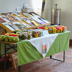 Mit Unterstützung von freiwilligen HelferInnen und einer großen Menge gesammelten Kräutern werden am Tag vor der Messe die Sträuße gebunden.