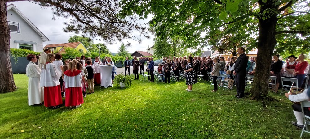 Im Anschluss an die Hl. Messe, zelebriert von Vikar Gerhard Hatzmann und begleitet von Kantorin, Lektoren und liturgischen Diensten beider Pfarren, fand eine Andacht bei den vier Stationen am Dorfplatz statt. Für die kleine Prozession waren vier Brottische als Altäre gerichtet, als Sinnbild für die vier Himmelsrichtungen und dafür, dass Christus der Heiland der ganzen Welt ist. Im gemeinsamen Liedruf "Brot des Lebens" zogen die liturgischen Dienste und die Kinder stellvertretend für das Volk Gottes zu den vier Altären: Brot der Liebe – Brot der Versöhnung – Brot des Friedens – Brot der Hoffnung. Zum Abschluss erteilte Vikar Hatzmann den Eucharistischen Segen, verbunden mit der Einladung, das Allerheiligste gemeinsam zur Kirche zu begleiten. Die Feier schloss mit dem gemeinsam gesungenen "Te Deum" ab. Zu den Feierlichkeiten waren auch die Vereine wie Feuerwehr und ÖKB eingeladen.