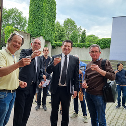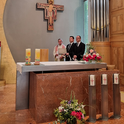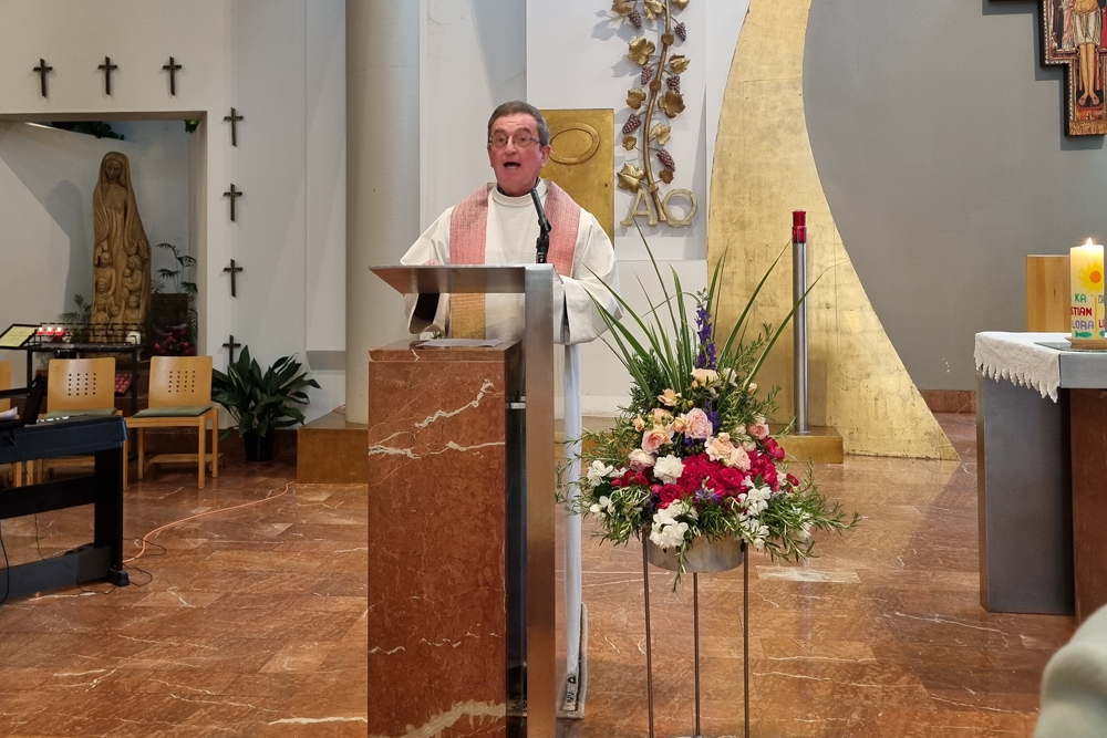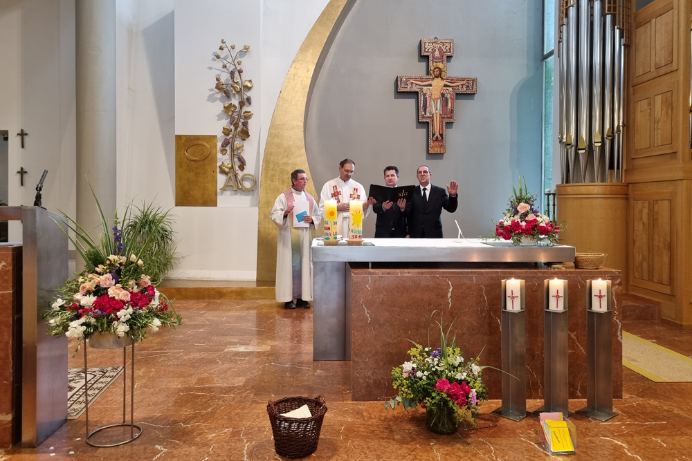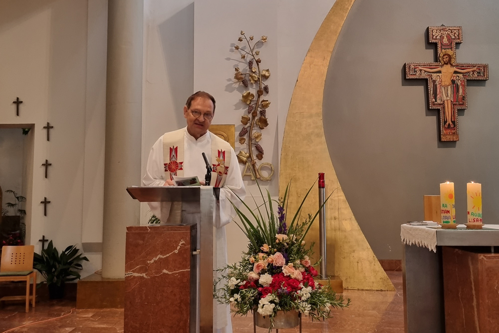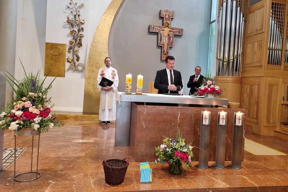 Um den Altar versammelten sich Vikar Gerhard Hatzmann (Röm. Kath. Kirche), Reiner Hasenauer und Thomas Brantner (Neuapostolische Kirche) sowie Franz Handler (Altkatholische Kirche), um gemeinsam mit den Gläubigen zum Thema „Früchte des Geistes“ zu feiern und in die Tiefe des Wortes Gottes einzutauchen.