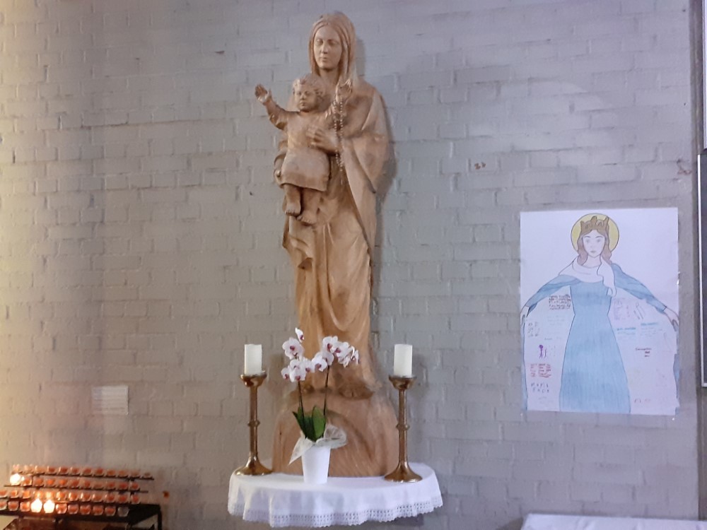 Das Bild unserer Schutzmantelmadonna mit den Bitten hängt in der Kirche bei der Marienstatue und lädt zum Entzünden einer Kerze ein.