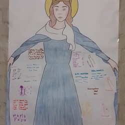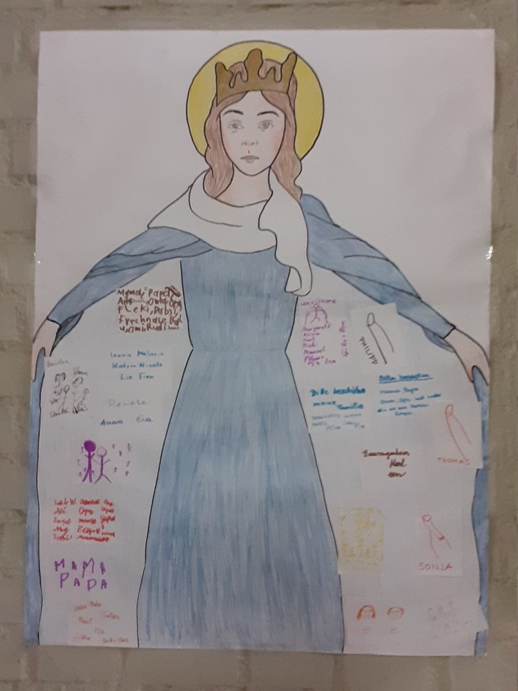 Musikalisch begleitet von Eva und Anna Ressmann, sowie Kathi und Lisa Müllerferli durften die Anwesenden zum Thema Schutzmantelmadonna bei der Maiandacht jene Menschen symbolisch unter Marias Schutz stellen, für die sie besonders bitten wollten. Die Kinder waren eingeladen, sich und ihre Familien unter den Mantel zu zeichnen und Blumen als Altarschmuck zu bringen.