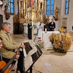 Von der schwungvollen Musik unserer Musikgruppe begeistert, sangen wirklich alle gerne mit, vom Kirchenchor bis zu den VS-Kindern, deren besonderer Erntedankschmuck übrigens nun die Empore im Altarraum ziert.