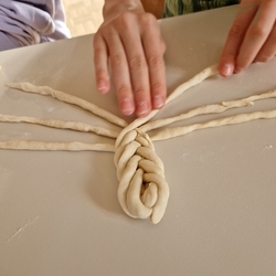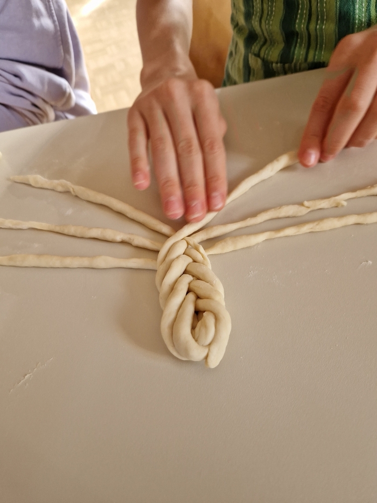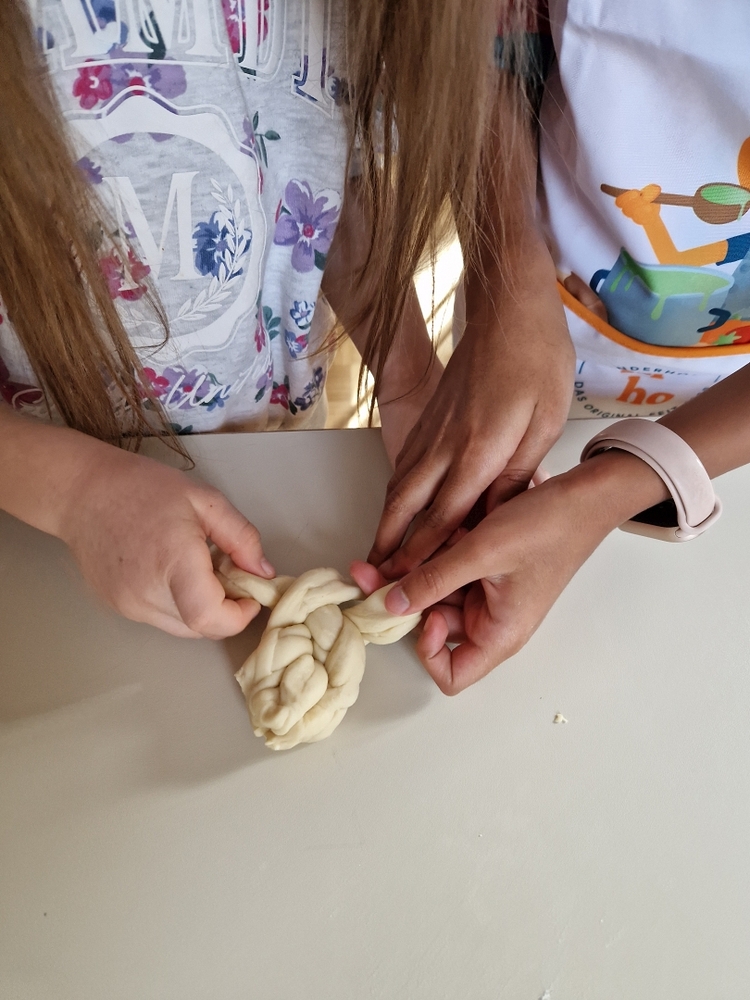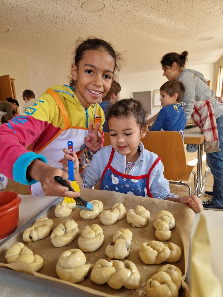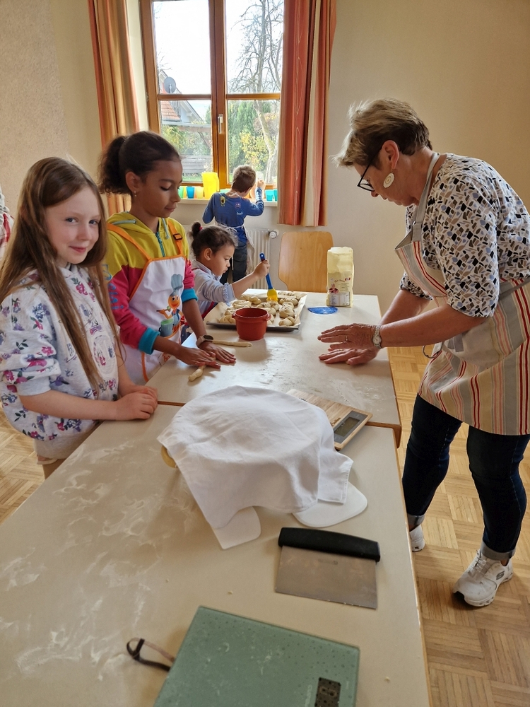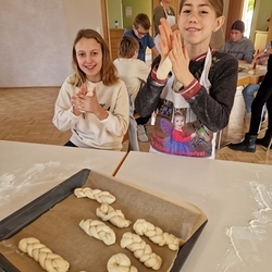 Am 31. Oktober fanden sich auch heuer wieder viele große und kleine Bäckerinnen und Bäcker im Pfarrheim ein, um aus 12 kg Germteig herrliche Allerheiligenstriezerl zu formen. Sieben Erwachsene sowie alle Minis und eventuell zukünftige Minis (insgesamt 16 Kinder) waren von 9 -11 Uhr mit Feuereifer dabei.