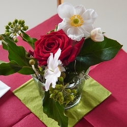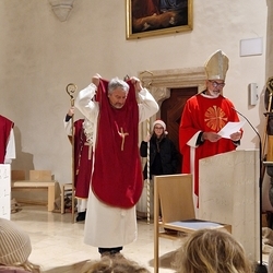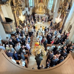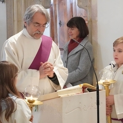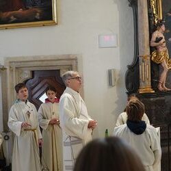Vor dem Schlusssegen überreichte Ernst Pock im Namen der Pfarre dem neuen Diakon ein Aspergill, mit dem dieser gleich voll Freude die Gläubigen segnete. Für seine Ehefrau Eva, die ihm begleitend zur Seite steht, gab es einen Blumenstrauß, mit den besten Wünschen für sie.