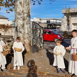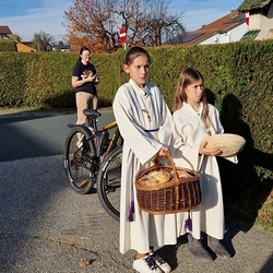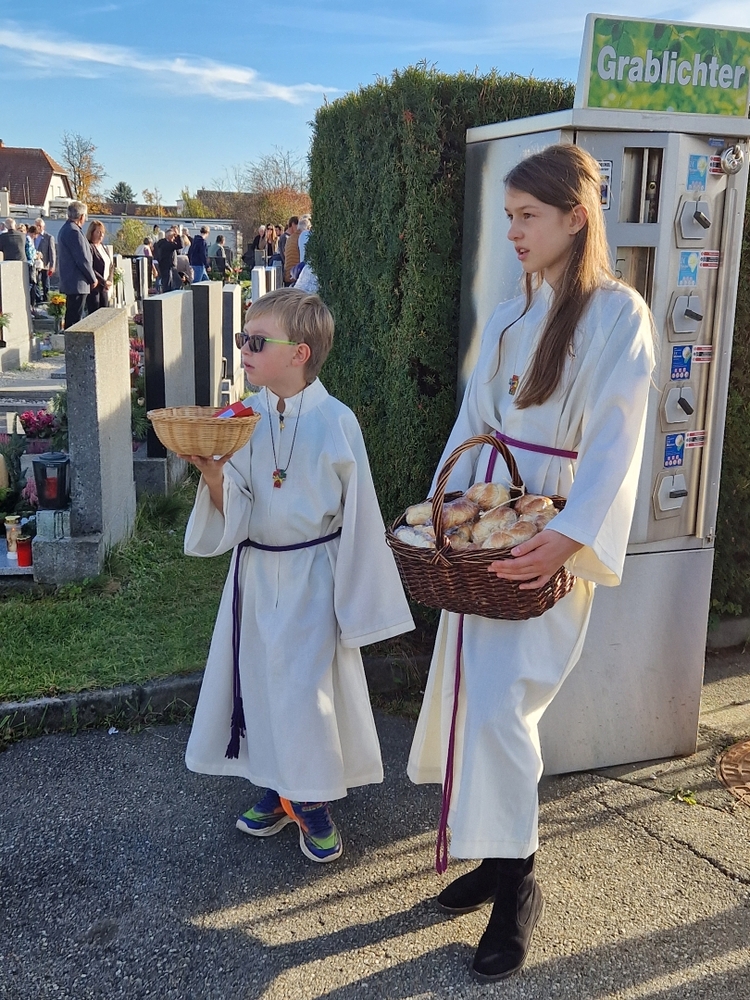 Zum Abschluss boten die bei der Feier fleißig assistierenden Minis an den Friedhof-Ausgängen gegen freiwillige Spende ihre am Vortag gebackenen Allerheiligenstriezerl an, die im Nu ausverkauft waren!