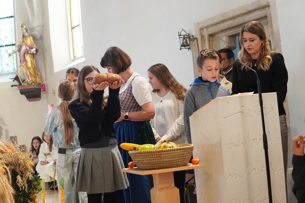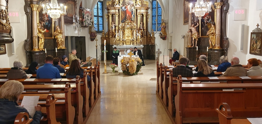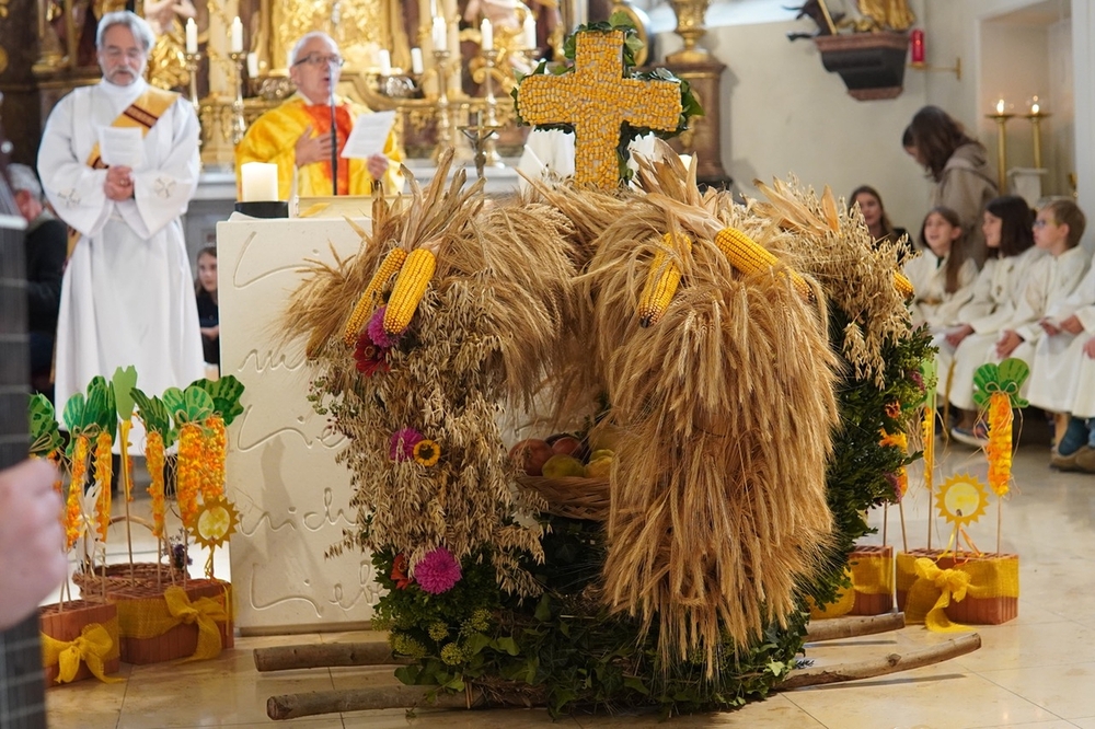 Nach dem feierlichen Einzug fand die Erntedankkrone, dieses liebevoll geschmückte Symbol reicher Ernte, vor dem Altar ihren Ehrenplatz. Danke der Landjugend Zettling für diese schöne Tradition!