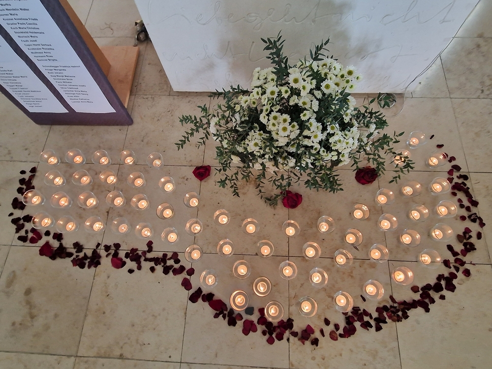 Vor dem Altar brannten 59 Teelichter für alle Menschen, die im letzten Jahr in unserer Pfarre verstorben sind. Ihre Namen wurden noch einmal laut ausgesprochen. Ein Teelicht leuchtete für alle Verstorbenen, die ungenannt blieben.