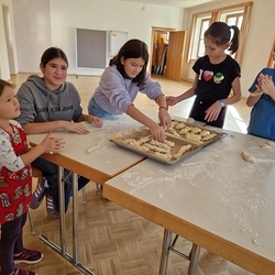 Dank Elena im Kindergarten Premstätten hatten sie neben dem Herd im Pfarrhof auch noch zwei weitere Herde in Verwendung, um die große Menge an geformten Teiglingen zu Köstlichkeiten zu verwandeln.