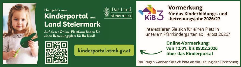 Die Vormerkung für das jeweilige Kinderbildungs- und -betreuungsjahr wird ab Mitte Jänner ausschließlich im Kinderportal des Landes Steiermark unter folgendem Link möglich sein: https://kinderportal.stmk.gv.at/